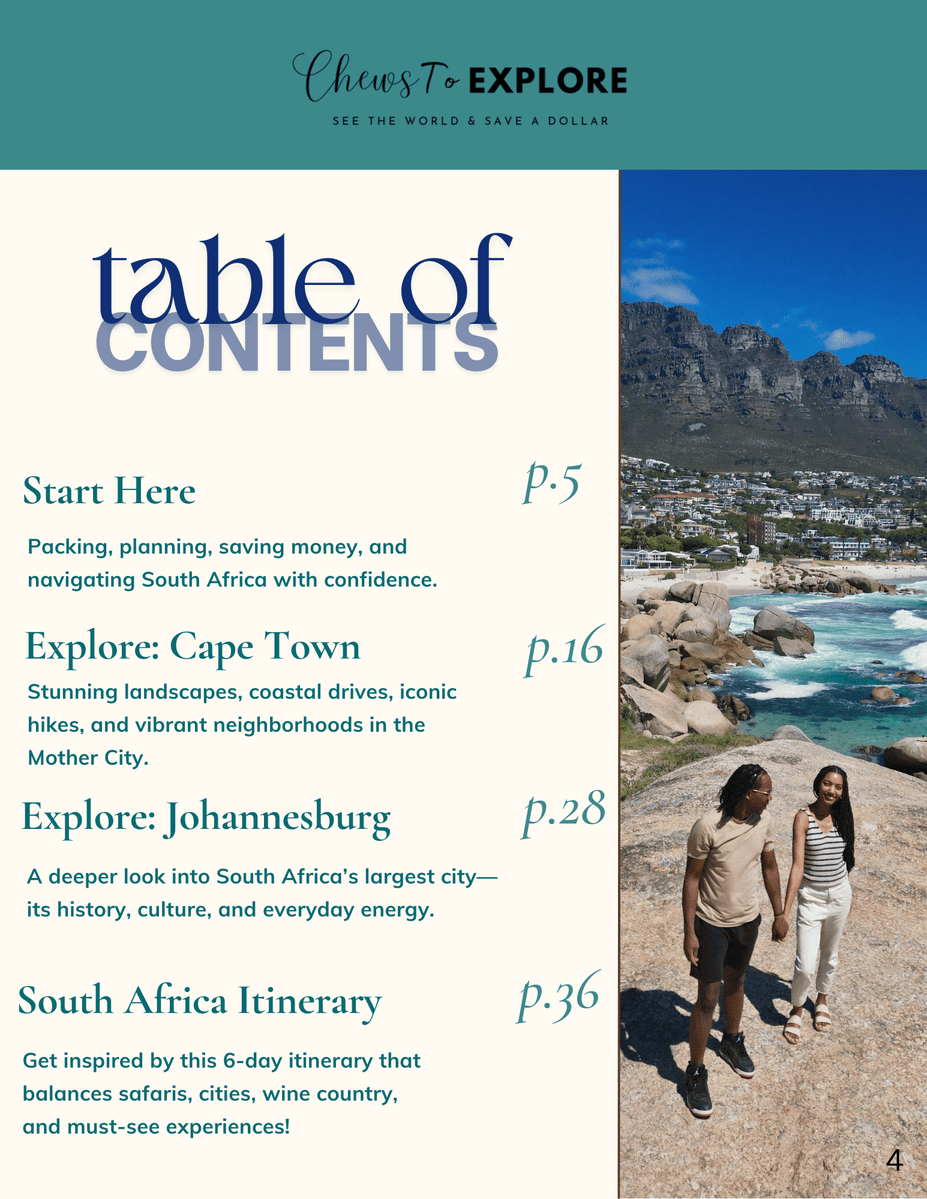 This curated digital guide simplifies planning for South Africa — covering how to get around, money-saving tips, must-see sights, where to stay, what to eat, and a realistic multi-day itinerary that actually works.